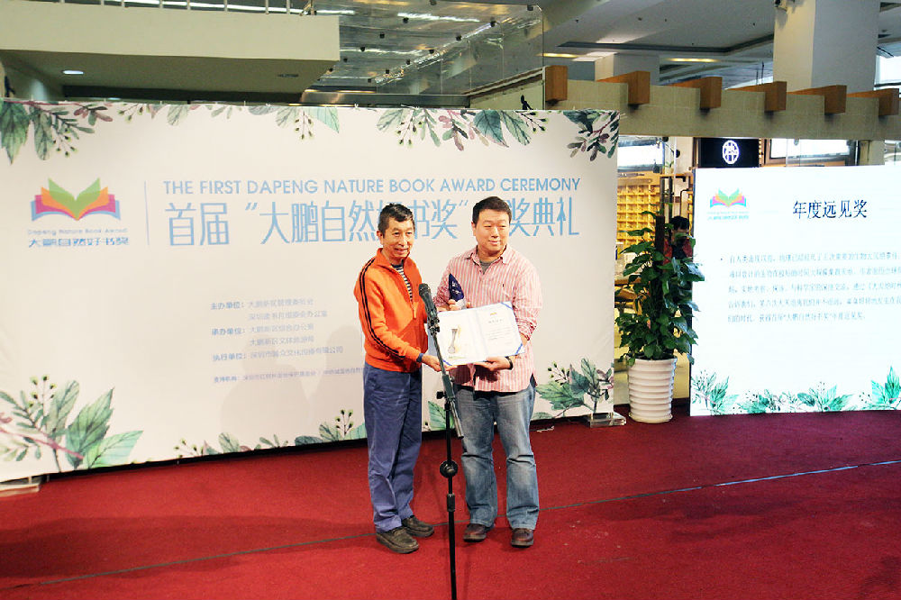 叶盛副研究员 (右) 在“大鹏自然好书奖” 领奖台上