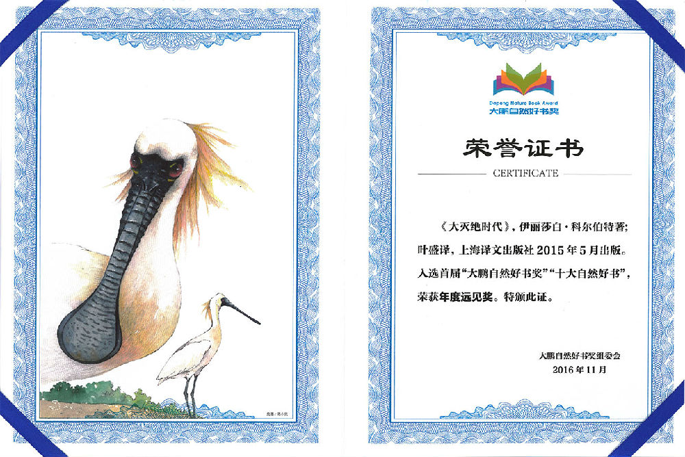 11月26日,首届“大鹏自然好书奖”于深圳书城中心城举行颁奖仪式,现场隆重揭晓了“十大自然好书”。其中,由中科院生物物理所叶盛副研究员所译的《大灭绝时代》入选,荣获年度远见奖。该书已于年初获得国家图书馆“文津奖”的科普类推荐图书奖,而其原著《The Sixth Distinction》于去年获得了普利策奖的非虚构类写作奖。