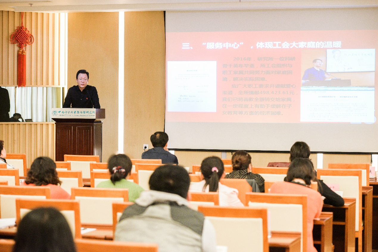 财务处处长程亚利作财务工作报告,对所2016年财务预算执行情况、经费使用情况等向大会进行报告;科技合作与成果转化处处长孙哲作所经营性资产管理工作报告;党委办公室主任兼纪监审办主任栾贵波作2016年度研究所内部审计工作报告,通报了上一年度内部审计中发现的问题和今年的工作重点。