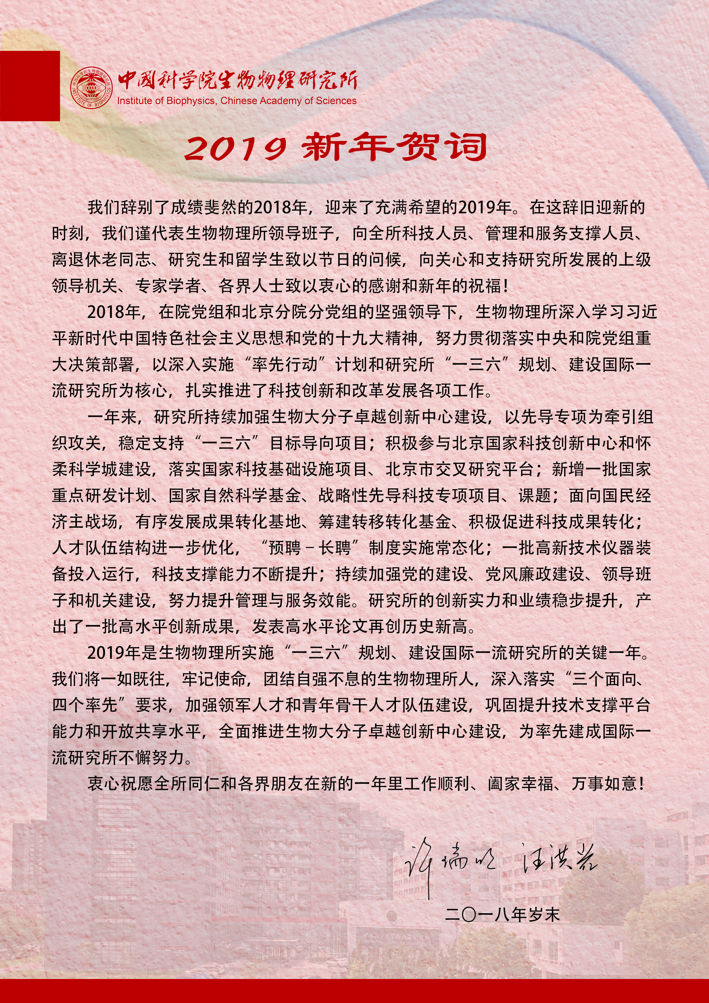 我们辞别了成绩斐然的2018年,迎来了充满希望的2019年。在这辞旧迎新的时刻,我们谨代表生物物理所领导班子,向全所科技人员、管理和服务支撑人员、离退休老...