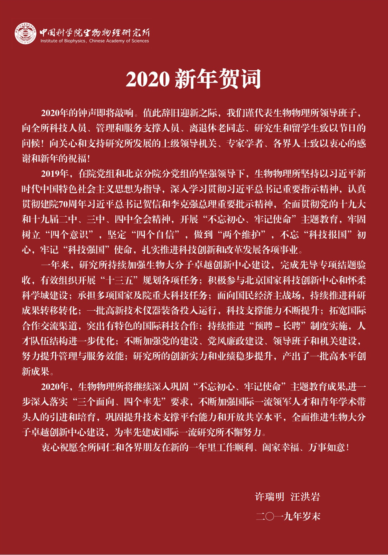 2020年的钟声即将敲响,值此辞旧迎新之际,我们谨代表生物物理所领导班子,向全所科技人员、管理和服务支撑人员、离退休老同志、研究生和留学生致以节日的问...