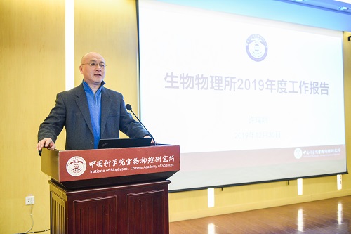 许瑞明在2019年度工作情况的报告上指出,在院党组和北京分院分党组的坚强领导下,生物物理所坚持以习近平新时代中国特色社会主义思想为指导,扎实贯彻党的十九大和十九届中央历次全会精神,以“三个面向”为方向,以“四个率先”为奋斗目标,求真务实,凝心聚力,努力推进研究所科技创新和改革发展各项工作,圆满完成2019年度各项任务。