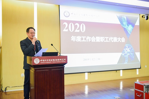 2019年12月30日,生物物理所召开2020年度工作会议暨职工代表大会。北京分院人事干部处处长欧云、所领导许瑞明、汪洪岩、刘力、杨兴宪、朱冰出席。研究所党委委员、纪委委员、职代会主席团成员、各重点实验室负责人、课题组长、管理部门中层领导人员及职工代表140人参加会议。大会由许瑞明所长和汪洪岩书记共同主持。