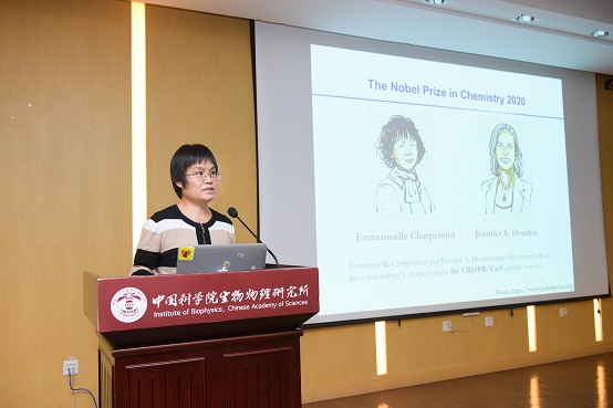 2020年诺贝尔化学奖授予法国科学家Emmanuelle Charpentier和美国科学家 Jennifer Doudna以表彰他们"开发基因编辑方法"的贡献。我所王艳丽研究员作为CRISPR领域的专家,为大家生动的展示了CRISPR领域的研究历史,诺贝尔奖获得者的研究成果和CRISPR-Cas9的应用,深入浅出的为我们介绍了Charpentier和Doudna获得诺贝尔奖的研究成果。此外,王老师还介绍了诺贝尔奖背后的其他英雄们:发现DNA修复引发基因编辑的Maria Jasin,早期CRISPR领域奠基人Francisco Mojica,发现I型CRISPR-Cas免疫机制的John Van der Oost,与Charpentier和Doudna同期发现Cas9基因编辑功能的Virginijus Siksnys以及首次在真核细胞中实现基因编辑的Feng Zhang等。这些杰出的学者们串起了CRISPR领域以及基因编辑领域的研究历史。作为一个结构生物学领域的专家,王老师还向我们展示了Cas9剪刀的结构以及Cas9在结合RNA,DNA之后的构象变化,解释了Cas9行使基因编辑功能的分子机制。