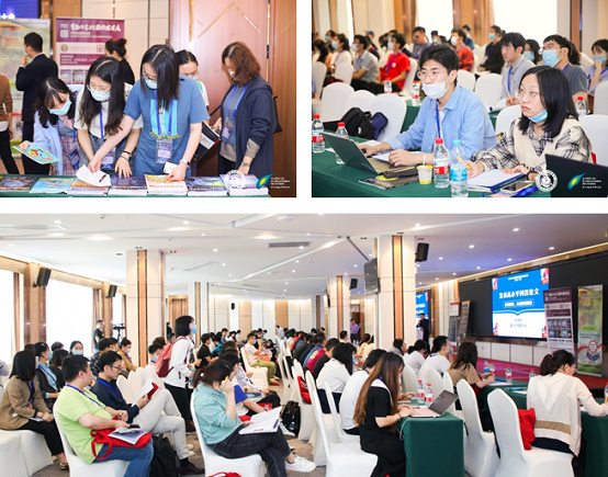图2 与会者翻阅期刊(左上),专注听会(右上),会场座无虚席(下)