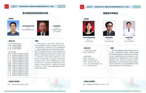 来自医疗卫生系统、中科院、高校、军队等63个单位的研讨会的组织者115人,共组织了52个认知科学和脑疾病的专题研讨会。这 52个研讨会把知觉、注意、记忆、学习、情感、意识等多个认知层次的基础研究,以及脑成像和脑影像学的研究,密切结合到脑血管病变、脑卒中、脑肿瘤、癫痫、老年痴呆、中枢性运动障碍、精神分裂症、抑郁症、自闭症、成瘾、睡眠障碍、注意缺陷多动障碍、青光眼和近视的中枢机制、植物人的残存认知功能、神经调控治疗等临床和临床基础的研究(https://v.alltuu.com/album/1035431713/?from=qrCode)。