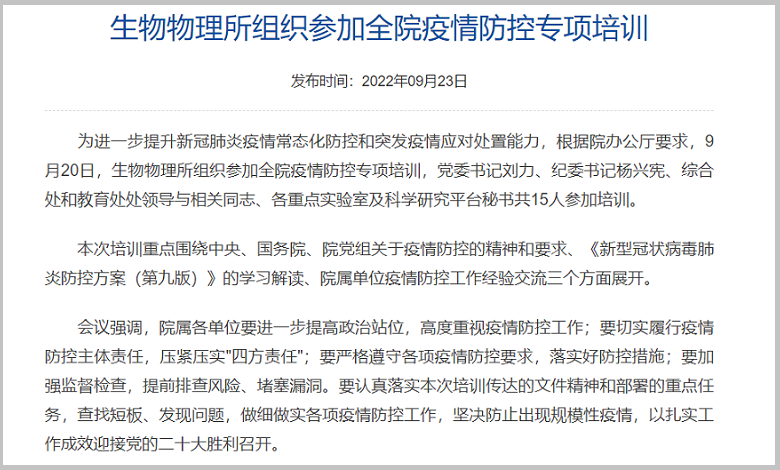 为进一步提升新冠肺炎疫情常态化防控和突发疫情应对处置能力,根据院办公厅要求, 9月20日,生物物理所组织参加全院疫情防控专项培训,党委书记刘力、纪委书...