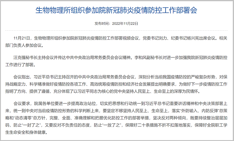 生物物理所传达学习院党组2022年夏季扩大会议精神