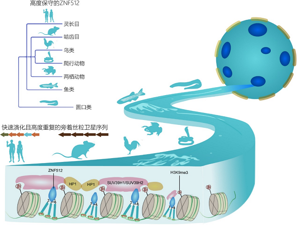 朱冰团队发现保守的锌指蛋白ZNF512利用其非连续排布的锌指结构域识别富集于旁着丝粒区内的保守的不连续的TTC序列元件,并直接招募SUV39H家族蛋白,从而起始异染色质形成。在回答了近百年的科学困惑的同时,本发现也为TTC元件异常扩增导致FXN基因异染色质化并诱发共济失调症提供了机制性解释。