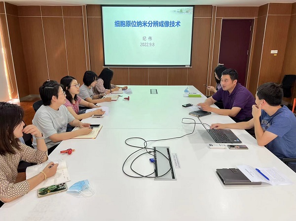 调研团队实地参观课题组实验室,听取纪伟老师介绍实验室的发展历程及工作环境情况。纪伟老师向调研团队介绍了细胞原位纳米成像技术的发展、实验室的研究成果以及未来发展方向等。与会同志围绕研究所改革创新发展、科研项目管理、成果转化、团队合作、经费管理、人才队伍建设、研究生培养教育和机关部门工作作风等主题进行深入讨论交流。