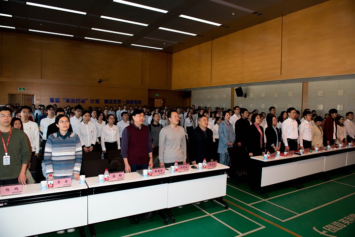 国歌奏响,全体奏唱完国歌后,各科研单元的7位辅导员以诗朗诵的形式带领大家回顾了新中国成立70年来科技强国之路的种种艰辛和辉煌成就,讴歌新中国成立七十周年、中科院建院七十周年以来我国和我院在科技、文化、军事等领域取得的巨大成就,深情抒发对党的无限忠诚和对祖国的无限热爱之情。