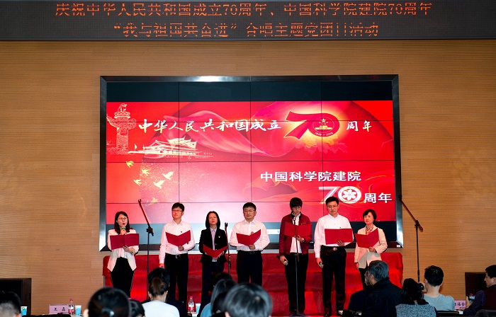 国歌奏响,全体奏唱完国歌后,各科研单元的7位辅导员以诗朗诵的形式带领大家回顾了新中国成立70年来科技强国之路的种种艰辛和辉煌成就,讴歌新中国成立七十周年、中科院建院七十周年以来我国和我院在科技、文化、军事等领域取得的巨大成就,深情抒发对党的无限忠诚和对祖国的无限热爱之情。