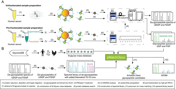 A:血清蛋白质样品和N-链接完整糖肽样品经过预分与不预分的处理过程;