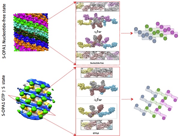 孙飞课题组利用冷冻电镜螺旋三维重构技术,解析了剪切的短型S-OPA1与脂质体形成的螺旋三维结构。结构表明,与经典的Dynamin家族蛋白结构类似,S-OPA1也可分为用于GTP水解的GTPase结构域,介导高聚组装状态形成的Stalk区域和膜结合相关的EMB结构域三部分。在螺旋结构中,S-OPA1呈现出六股螺旋同时组装的高聚形式,组装中的最小不对称单位为二体,相邻不对称单位之间有4个相互作用面,分别为I1,I2,I3,和P1 。这些作用面对stalk区域的相互作用及成管起至关重要的作用。突变体实验表明EMB结构域中存在促使S-OPA1引起膜形变并进行管状组装的关键位点。进一步突变体实验表明S-OPA1的成管过程与GTP的结合和水解无关,然而膜结合对于S-OPA1的GTP水解活性有显著增强作用,提示GTP水解发生在S-OPA1促进膜融合的晚期过程。