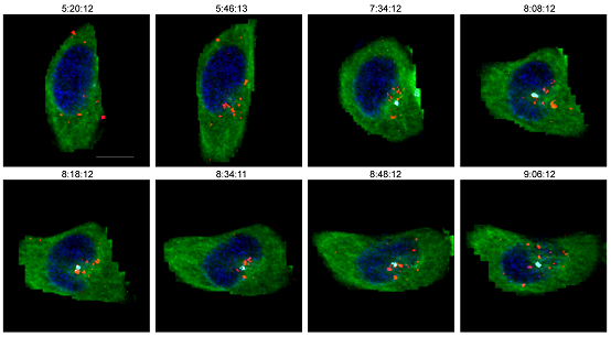 图1:HIVVpr-mCherry病毒NL4-3(KFS) 毒株在TZM-bl细胞中的实时成像。动态追踪病毒颗粒在MTOC附近的聚集行为和由细胞质到细胞核的转运过程。细胞核DNA(蓝色),微管(绿色),MTOC标志蛋白γ-tubulin(绿松石),病毒Vpr蛋白(红色)。标尺:10μm。