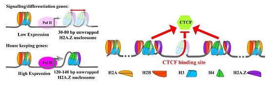 左图:DNA展开至30-80bp的H2A.Z核小体定位在低表达基因的启动子上,并富集了信号转导和细胞分化相关的基因;DNA展开至120-140bp的H2A.Z核小体定位在高表达基因的启动子,并富集了管家基因。右图:展开的H2A.Z核小体定位于CTCF结合位点上与其两侧的核小体位置,分别和抑制与促进CTCF结合相关。