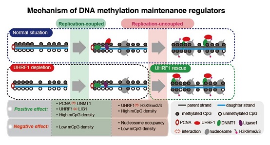结合Hammer-seq和系统性地突变DNA甲基化维持可能相关的各种蛋白因子,本工作解析了调控复制偶联和非偶联阶段甲基化维持的相关机制。其中,DNMT-PCNA以及UHRF1-LIG1的相互作用促进了复制偶联阶段甲基化的快速维持,UHRF1-H3K9me2/3的相互作用促进了复制非偶联阶段的甲基化维持速率,核小体的存在本质上则会减缓复制非偶联阶段的甲基化维持速率,而LSH相对特异地促进复制晚期区域的复制非偶联阶段的甲基化维持速率。同时,当复制偶联阶段的甲基化维持受到了破坏,甲基化可以在复制非偶联阶段得到很大程度的维持,说明复制非偶联阶段保留了很强的甲基化维持能力。另外,甲基化CpG密度高的区域,不仅具有较高的甲基化维持速率,其从头甲基化发生频率也较高。