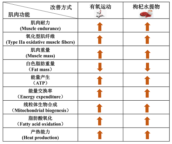 表1 枸杞水提物与有氧运动增强肌肉功能比较