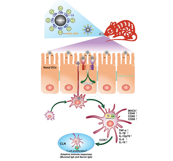 流行性感冒是由流感病毒引发的呼吸道传播疾病,历史上每次流感病毒的大流行都给人类健康和社会经济造成巨大损失。目前防控流感最常用的策略是肌肉注射流感病毒灭活疫苗。但肌肉注射途径的疫苗难以在黏膜部位诱导特异性SIgA黏膜抗体以有效阻断病毒的入侵和散播。鼻腔是流感病毒进入宿主的主要入口,如果在鼻腔和上呼吸道建立有效的黏膜免疫保护,将有效阻止流感病毒的早期入侵。但是目前存在的关键问题是流感病毒疫苗较难突破黏膜屏障的阻挡,难以通过鼻腔粘膜诱导有效的免疫应答。