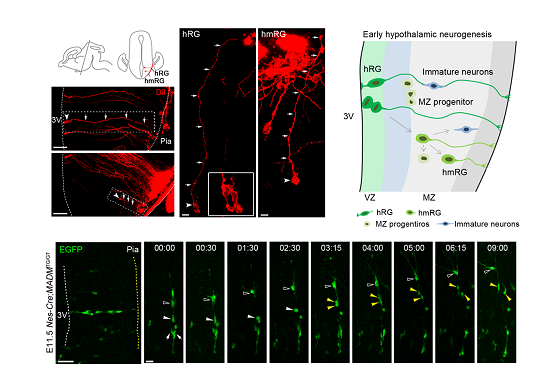 在该工作中,研究人员发现在哺乳动物(人和小鼠)胚胎下丘脑中既存在典型的位于第三脑室的放射状胶质(hypothalamic radial glia, hRG),又找到了一种新的位于下丘脑外套层的单极RG,称之为hmRG (hypothalamic mantle zone radial glial)。通过实时成像及免疫染色表明,hRG和hmRG在细胞分裂时分别历经动力核迁移过程和细胞易位过程,并产生子代前体细胞或神经元细胞。谱系追踪实验表明在下丘脑发育早期,hmRG细胞以及后续的神经发生都起始于hRG细胞,部分细胞谱系呈现放射柱状分布。hRG细胞上的放射状胶质纤维束朝向特定下丘脑不同核团亚区延伸分布,被认为可能作为支架引导新生神经元的迁移方向和最终定位。