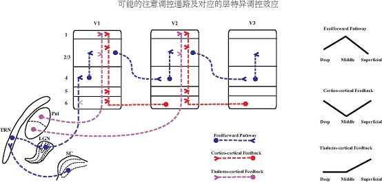 注意是人脑重要的高级认知功能,能够有效分配大脑有限的认知资源,选择性处理重要的信息。人类视觉注意相关的神经环路机制目前并不清楚。如下图所示,注意可能通过三条神经通路调制视皮层的反应,包括皮层-皮层反馈,丘脑-皮层反馈,以及皮层下前馈通路。这三条通路分别调制视皮层表层和深层的神经活动(皮层-皮层反馈),表层的神经活动(丘脑-皮层反馈),或中间层的神经活动(前馈通路)。因此,通过分层功能磁共振方法可以对这些假设进行直接的验证。