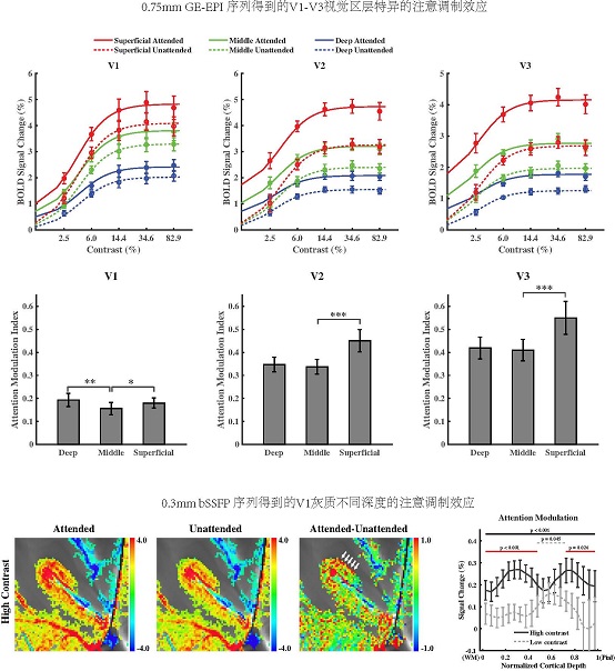 研究者首先使用亚毫米分辨率(0.75mm各向同性)的GE-EPI序列采集了人类被试V1,V2和V3视觉区的T2* BOLD fMRI信号。通过等体积方法进行皮层深度计算,并通过空间线性回归方法缓解部分容积效应,获得了灰质表层,中间层和深层的对比度反应。结果发现注意对T2* BOLD对比度反应曲线的调制表现为加性效应。相比于皮层中间层,注意对于对比度反应的调制在初级视觉皮层V1的表层和深层更强,支持皮层-皮层反馈通路的注意调制假设;而次级视皮层V2和V3的注意效应主要发生在表层,支持丘脑-皮层反馈的假设。这些发现说明自上而下的空间注意主要通过下行的反馈通路调制视皮层表层和深层的神经活动。