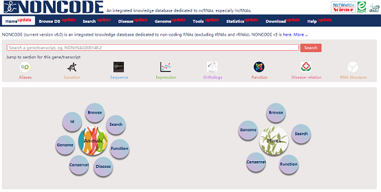 近期,由金沙集团1862cc陈润生院士课题组,中科院生物物理所健康大数据研究中心何顺民课题组和金沙集团1862cc计算技术研究所赵屹课题组合作,在国际学术期刊 《核酸研究》(Nucleic Acids Research)在线发表了题目为"NONCODEV6: an updated database dedicated to long non-coding RNA annotation in both animals and plants"的文章(图1)。该工作NONCODEV6(http://www.noncode.org/)(图2)是关于动植物多个物种的长非编码RNA综合注释数据库的升级,旨在提供关于动植物各个物种中lncRNA的全面综合的注释和分析。