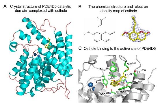 图2 PDE4D5催化结构域与蛇床子素复合物结构(A);蛇床子素的化学结构式及电子云密度图(B);蛇床子素结合PDE4D5催化结构域中心位点信息(C)。