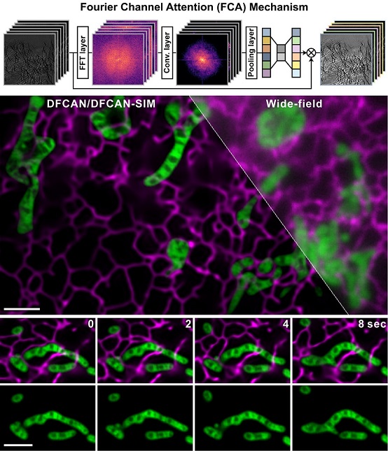 上图为傅立叶域注意力机制深度学习算法框架图。下图是基于DFCAN和DFGAN结构光超分辨重建活细胞内的线粒体内膜结构(绿色)和内质网(紫红色),捕捉到线粒体在内质网与线粒体接触位点线粒体融合的动态过程。