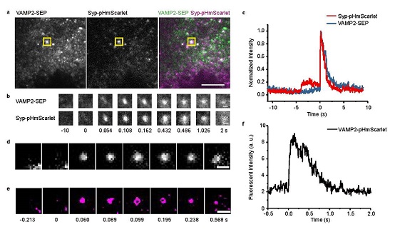 图1 (a-c)pHmScarlet与pHluorin对不同囊泡膜蛋白进行双色成像;(d-f)囊泡分泌事件的超高分辨显微成像