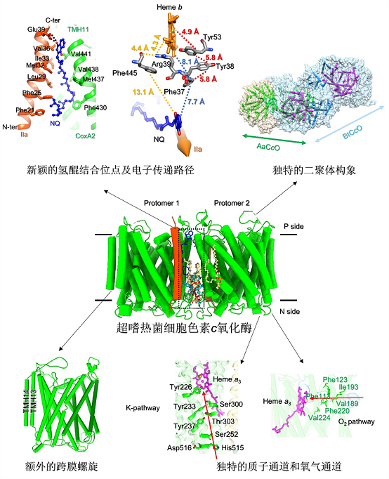 超嗜热菌细胞色素c氧化酶冷冻电镜三维结构。独特的二聚体构象允许其既能氧化细胞色素c又能氧化氢醌,额外的跨膜螺旋、质子通道和氧气通道等新颖结构特征揭示了细胞色素c氧化酶在极端环境下的进化适应性。