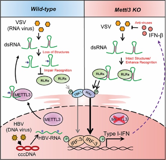 图1. 机制示意图:METTL3介导的m6A修饰通过抑制dsRNA形成削弱RLRs对病毒的识别从而促进病毒免疫逃逸。