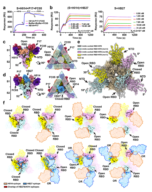 在前期双抗体鸡尾酒研究的基础上(Cell Research,2020b),为了探索含有三种或四种NAbs组合的鸡尾酒的可能性,该团队通过竞争性表面等离子共振(SPR)技术验证了由FC05、H014和P17组成三抗体鸡尾酒的理论可行性,并且发现在RBD与H014或P17部分饱和的条件下,HB27很可能作为第四个组分构成四抗体鸡尾酒。有趣的是,研究团队发现了H014抗体对HB27抗体的协同促进机制,即在H014结合的前提下,HB27对S三聚体的亲和能力提高了100倍以上。