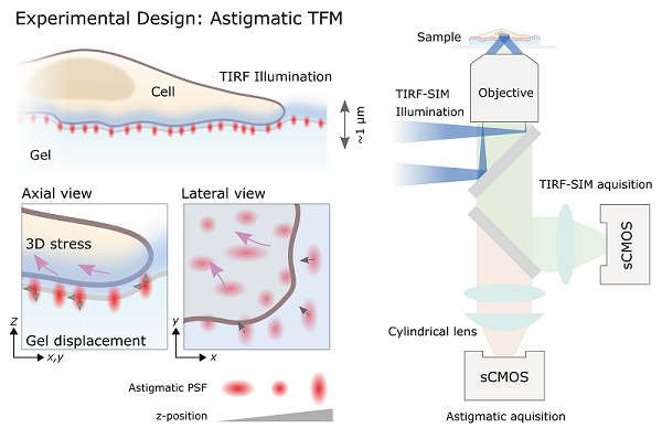 生物力学(mechanobiology)是研究生命活动中相关力学特性的学科。细胞的生物力学特性与生命活动的许多功能相关,比如肿瘤免疫过程、器官的衰老、皮肤和伤口愈合、血管形成、淋巴功能、骨骼、神经元和眼睛活动等生命过程。这些微观力学过程通常发生在亚微米、皮牛和亚秒尺度。牵引力显微镜(traction force microscopy)是最广泛应用于生物力学研究的技术之一,其利用弹性物质表面的荧光微球探针观测细胞和弹性物质互作过程中的微观作用力。但是传统的牵引力显微镜受限于获取微球位移的精度和速度,只能以稀疏的荧光微球作为探针进行慢速的微米尺度二维观测,应用范围大幅度受限。