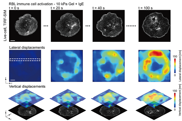 图2. aTFM-SIM活细胞成像观测RBL细胞免疫反应过程中的生物力,及其与微丝动态形变的关联。