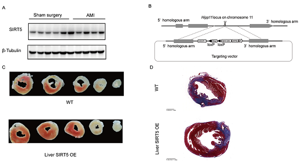 图1. (A)急性心肌梗死造模手术后小鼠肝脏中SIRT5蛋白的表达水平升高。(B)通过CRISPR/Cas9基因编辑技术构建肝脏特异性过表达SIRT5的转基因小鼠 (Liver SIRT5 OE) 小鼠。(C)急性心肌造模梗死造模手术引起的心肌损伤显著低于野生型小鼠。(D)急性心肌造模梗死造模手术引起的心脏纤维化显著低于野生型小鼠。