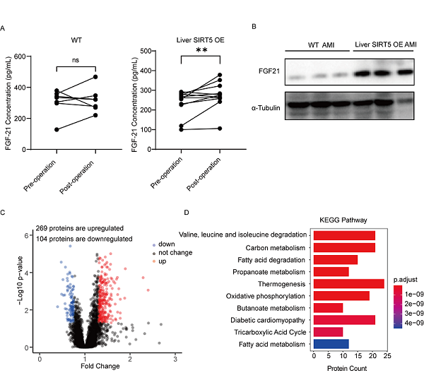 图2. (A) (B)急性心肌梗死造模手术后Liver SIRT5 OE小鼠血浆中及心肌中FGF21水平增加。(C)(D)比较定量蛋白组学及生物信息学分析结果显示Liver SIRT5 OE小鼠线粒体中糖脂代谢相关通路(三羧酸循环、脂肪酸β氧化、氧化磷酸化)多种蛋白的表达水平显著高于野生型小鼠。