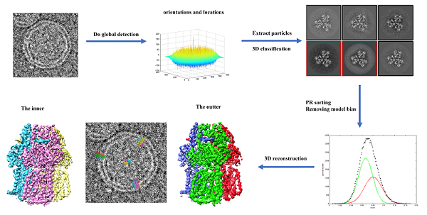 对处于复杂生物环境中的样品,目标蛋白在冷冻电镜图像中的密度与其他周围蛋白的密度重叠,本研究基于此开发了一种蛋白质识别算法,并对探测函数的最优权重进行了推导,新函数提升了叠合密度中探测目标蛋白的效率。结合排序函数减少蛋白质识别算法引入的假阳性数据,有效减轻模型偏差的影响,实现高分辨重构(图1)。该算法已经高通量的实现以下样品的高分辨结构解析:结合在脂质体上的膜蛋白、非二十面体病毒中的糖蛋白以及亚细胞单元中的蛋白质复合物。