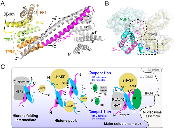 (A)sNASP TPR结构域二聚体的晶体结构;(B)sNASP-ASF1-H3-H4四元复合物的晶体结构;(C)组蛋白H3-H4在伴侣网络中接力传递的模式图