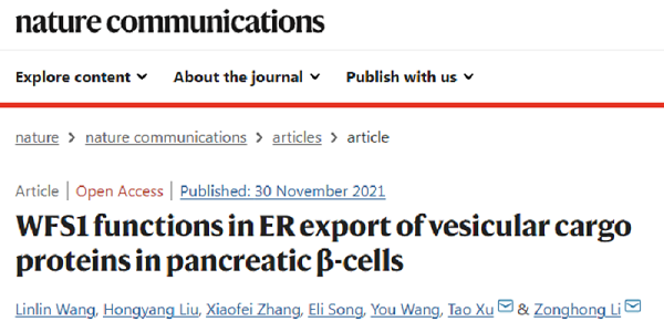 2021年11月30日,Nature系列子刊《Nature Communications》在线发表了徐涛院士团队题为"WFS1 functions in ER export of vesicular cargo proteins in pancreatic β-cells"的研究论文,该工作发现在WFS1的缺乏的小鼠胰岛中胰岛素原在内质网中异常累积,阻碍了胰岛素原转运至高尔基复合体中的加工以及胰岛素的分泌,揭示了WFS1在由内质网到高尔基复合体转运过程中起着重要作用。