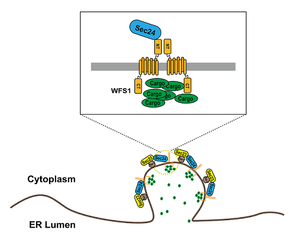 由内质网到高尔基复合体的蛋白运输是由外壳蛋白复合体II (COPII)小泡介导的,并需要特定的内质网膜受体蛋白分选货物进入COPII小泡中,然而这些受体蛋白大部分仍是未知的。该研究首次表明WFS1作为一个内质网中囊泡货物蛋白受体,介导了囊泡货物蛋白由内质网至高尔基复合体的转运。具体的分子机制为,WFS1通过其内质网腔 C末端直接与囊泡货物蛋白(包括胰岛素原)结合,而该区域内的致病突变(G695V、P724L、E809K 和 E830A)会破坏WFS1对囊泡货物蛋白的识别,损害了将货物蛋白分选到COPII小泡这一过程。而阻断COPII小泡介导的货物运输,会诱导胰岛β细胞的内质网应激和细胞凋亡。同时,在 WFS1的胞质N末端区域中编码着特定的内质网输出信号,可以被COPII亚基SEC24识别从而生成成熟的COPII小泡,N端部分的致病突变(E158K和E169K)会破坏WFS1在内质网上的定位及其与SEC24的相互作用,使囊泡无法正确运输至高尔基复合体。此研究不仅阐明了WFS1致病突变诱发的糖尿病的分子机制,同时还表明WFS1是囊泡货物蛋白由内质网到高尔基复合体的转运受体。