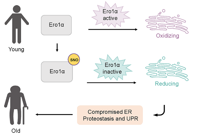 图: Ero1α亚硝基化修饰导致的内质网还原应激加速衰老模式图