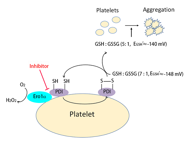 研究人员发现氧化态而非还原态PDI能促进血小板整合素αIIbβ3介导的血小板聚集和粘附。Ero1α和还原态PDI共同作用可以增强血小板聚集,说明Ero1α可以氧化PDI来调控血小板聚集。Ero1α小分子抑制剂能够抑制血小板内源的Ero1α特异性氧化PDI,而不影响其它蛋白质的氧化还原状态。血小板表面的Ero1α/PDI系统进一步氧化还原型谷胱甘肽(GSH)生成氧化型谷胱甘肽(GSSG),从而建立起一个适合血小板聚集的最佳GSH/GSSG电势。进一步研究发现,芦丁(rutin)等小分子抑制剂正是通过阻断Ero1α/PDI电子传递系统起到抑制血小板聚集的作用,提示靶向血小板表面的Ero1α/PDI系统可以作为抗血小板和抗血栓药物的新靶点。该项研究成果已经申请了中国发明专利。