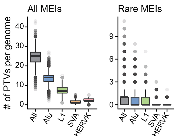 理论上,蛋白质编码区的MEI可以通过打断开放阅读框而导致基因功能丧失。作者在对MEI进行了功能注释后,发现每个人平均含有24个会截断蛋白质的MEI(图5)。结合短变异(SNP和 InDel)与其他结构变异来看,MEI贡献了每个个体中大约9.4%的蛋白质截断变异。这一结果表明了在全基因组数据的常规分析中纳入MEI的重要性。