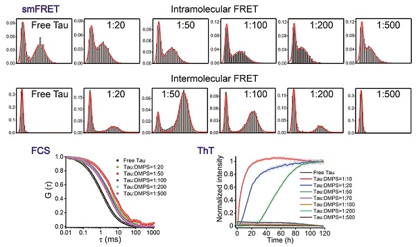 图1:单分子FRET和FCS技术揭示磷脂双层膜诱导Tau蛋白发生的分子内构象变化及其对Tau蛋白聚集的影响。