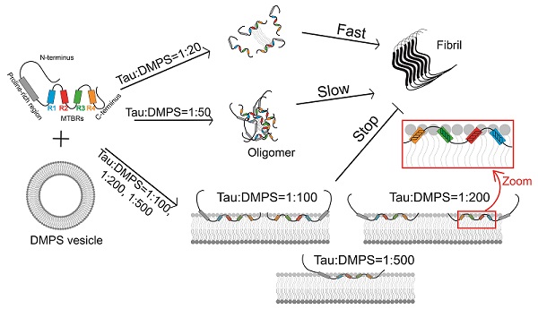 Tau是一类微管结合蛋白,主要参与细胞骨架中微管的组装和稳定。Tau蛋白的异常聚集与包括阿尔兹海默症在内的多种神经退行性疾病密切相关,但对于促发其细胞内聚集的机制尚无定论。研究表明,磷脂膜能够与细胞内的Tau蛋白发生互作,正常生理条件下,Tau蛋白与膜的互作与细胞器定位以及信号转导等过程相关;另一方面,Tau与磷脂膜的互作也被认为是细胞内诱发Tau蛋白淀粉样聚集的重要因素,同时Tau蛋白的寡聚体可进一步导致膜结构的破坏,引发细胞凋亡,导致退行性疾病的发生。目前,对于磷脂膜如何诱导Tau蛋白分子内的构象改变进而促进分子间聚集的机制尚未得到充分研究。阐明上述问题,对理解疾病的发病机制和相关药物的研发至关重要。