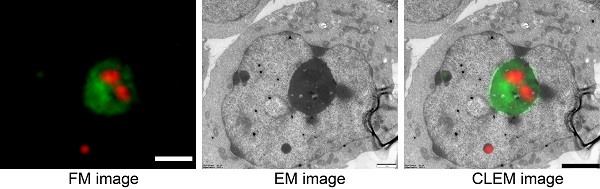 该研究工作以mEosEM为模板,通过定点饱和突变的方法得到了新一代荧光蛋白mEosEM-E。mEosEM-E具备光开关性质,可以在405纳米激光照射下转换为"亮状态",在488纳米激光照射下转换为"暗状态"。同时mEosEM-E继承了mEosEM抵抗电镜制样的特点,在经过电镜制样和Epon包埋之后依然能够在切片之上看到荧光信号并且保持光开关性质。为了能够进一步提高光学成像的信背比,解决树脂自发荧光对荧光信号的影响,研究者根据mEosEM-E的光开关性质,开发了图像相减的策略,通过对mEosEM-E处于两种状态的图像做减法,可以很大程度上去除树脂的自发背景荧光,整体信背比相比较于"暗状态"提高了14倍,相比较于"亮状态"提高了4.6倍。同时研究人员也对红色荧光蛋白进行了筛选,将电镜制样步骤进行拆分并分步检测不同红色荧光蛋白经过处理之后剩余的荧光,最终发现mScarlet-H的光电关联成像效果最好。另外研究人员发现常规的光电关联探针的筛选方法--检测探针经过锇酸处理之后的剩余荧光,并不能反映出荧光探针在电镜切片之上的效果,因为电镜制样步骤繁多,每一步骤都可能会对荧光造成损失,前期锇酸处理步骤后的荧光效果都不能表征荧光探针最后的效果,只有树脂切片上的荧光效果才可以衡量某一荧光探针到底是否适合光电关联成像。最后,利用mEosEM-E以及mScarlet-H成功实现了核仁的双色光电关联成像。该研究工作开发了新的光电关联成像探针与方法,同时将电镜制样步骤对荧光探针的影响做了定量分析,为细胞生物学以及光电关联成像领域提供了新的方法和工具。