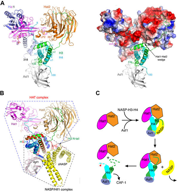 图1. Hat1-Hat2-Asf1-H3-H4-CoA复合物结构及其功能机理