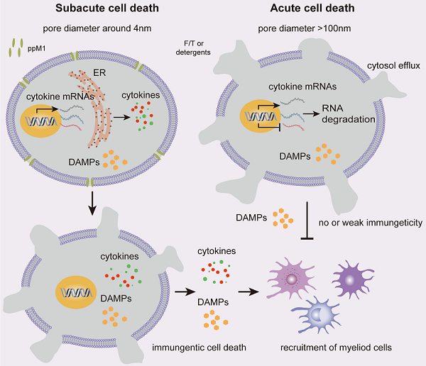 图. ppM1引发poroptosis的机制示意图。(由ppM1作用形成的纳米孔稳定且不可逆,可诱导肿瘤细胞亚急性死亡。处于亚急性死亡中的细胞可以在一段时间内维持相对完整的亚细胞器,从而可以继续细胞因子的基因转录或蛋白质翻译,从而触发免疫原性死亡,而冻融或洗涤剂诱导的急性细胞死亡则不能。)