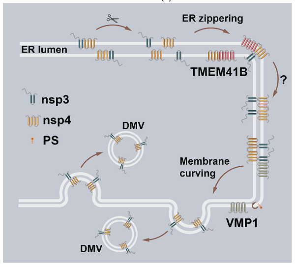 研究人员在线虫中进行全基因组RNAi筛选发现,敲低磷脂酰丝氨酸(phosphatidylserine, PS)的合成酶基因pssy-1可以抑制epg-3(VMP1的线虫同源基因)突变引起的线虫表皮细胞中脂滴的增大。在哺乳动物细胞中敲降pssy-1的同源基因PTDSS1也可以抑制VMP1敲除引起的脂滴增大,并可以部分逆转其DMV异常的表型。过去研究发现VMP1具有磷脂翻转酶(scramblase)功能,结合本研究结果,提示PS可能在DMV的形成中发挥了关键作用。